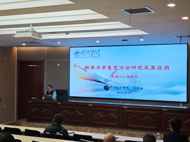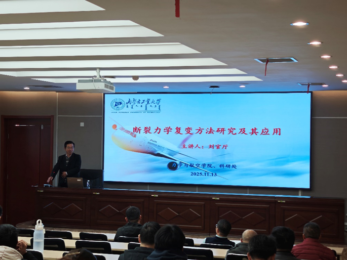 2025年11月13日,力学与航空学院特邀内蒙古师范大学刘官厅教授作题为“断裂力学复变方法研究及其应用”的学术报告。报告会由学院院长郭俊宏教授主持,学院领导、全体教师及部分研究生共同参加。